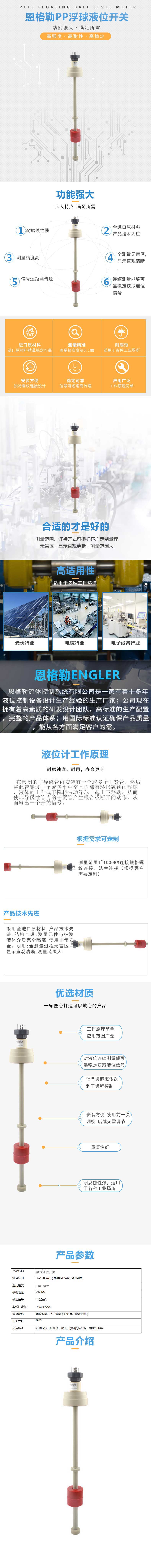 ENGLER PP浮球液位开关是一种安全可靠、使用方便、结构简单的液位计,体积小、速度快、工作寿命长,具有抗负载冲击能力强的特点,其在造船、造纸、印刷、发电机设备、石油化工、食品工业、水处理、电工、燃料工业、油压机械等方面都得到了广泛的应用。