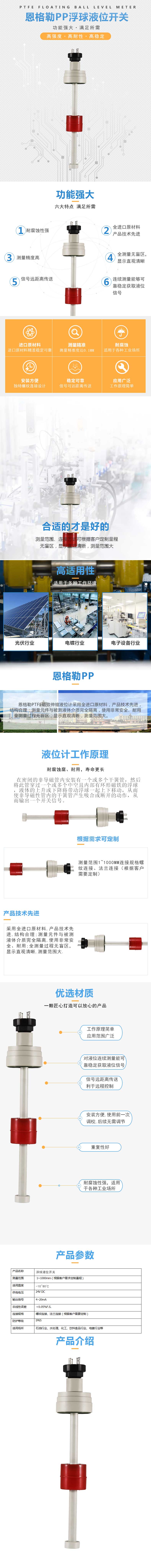 由pp材质制造成,结构简单的介质液位测量,使用安装便捷的液位控制器,因为安装没有复杂的电路,作业不受到影响,用户只要在选型时选择的材质选用正确,适用于任-何环境下对液体、压力或者温度都可以测量,尤-其对于地下贮槽、贮罐的液位为理想,液位开关在光伏、线路板、电镀等行业应用。