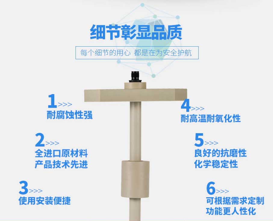 东莞市恩格勒流体控制设备有限公司高端制造的产品之一,采用磁性原理及阿基米德浮力定律,引进国外工艺流程,利用好品质塑料高分子材料,以0”缺陷为理念,从而开发研制的一种测量液体物位的新款测量装置,并在此工作原理上经过我们不断的实践,赋予了许许多多的功能,通过变送传感信号达到微机电子远程监控的目的。