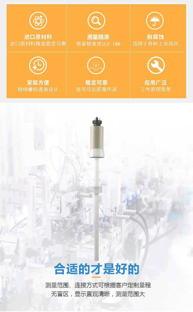 非线性误差:<0.05%F.S.;量程<300mm的传感器,误差<150μum
